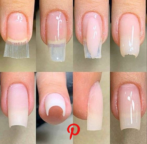 Pra isso, eu usei fibra de vidro e gel transparente até a fibra sumir e depois, adicionei um pouco de gel branco e misturei no transparente, pra obter um resultado mais leitoso e natural no alongamento. Como ela não queria reduzir o tamanho da própria unha, preenchi com gel embaixo também e alinhei com a broca, depois de fazer a curvatura C, conforme o formato das unhas naturais dela.