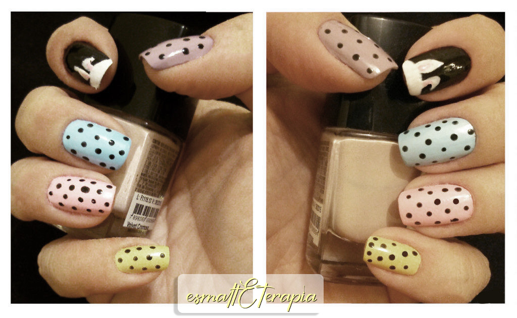 Então, nada demais, apenas uma brincadeira… Fiz cada dedo uma cor suave, tons pastel e a princípio, uma carinha de coelho em cada filha única, feitas no indicador. Ficou assim: